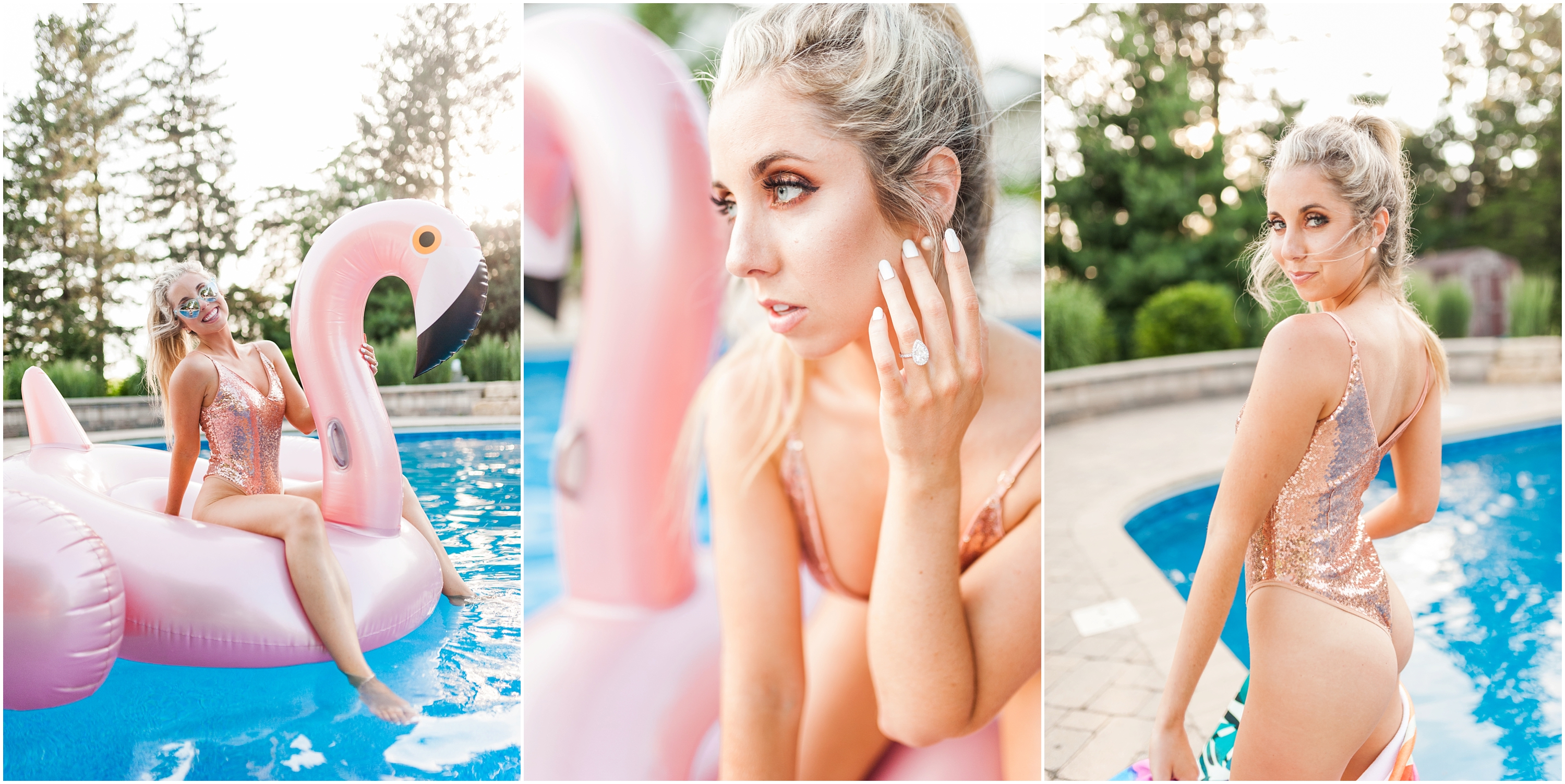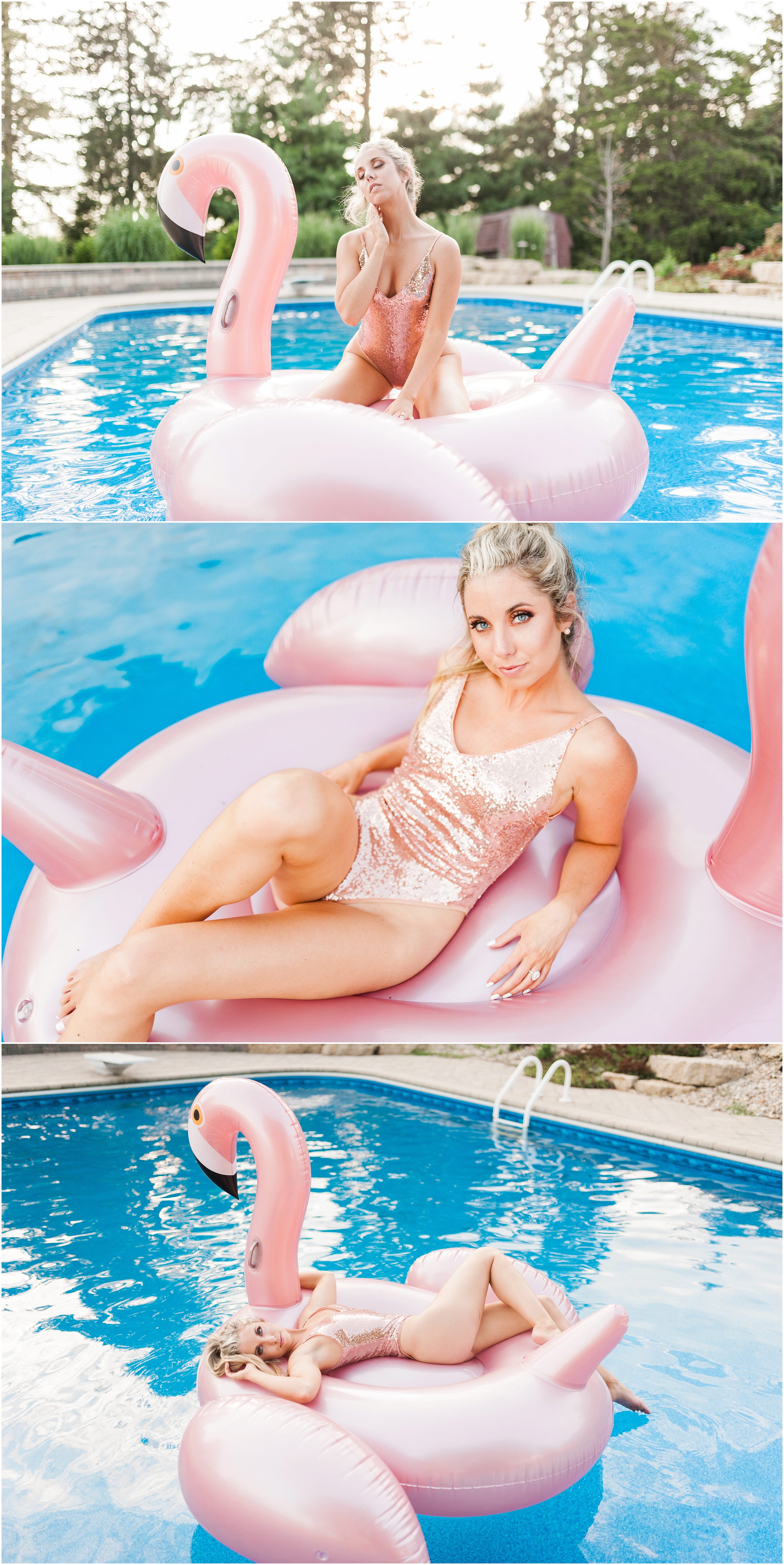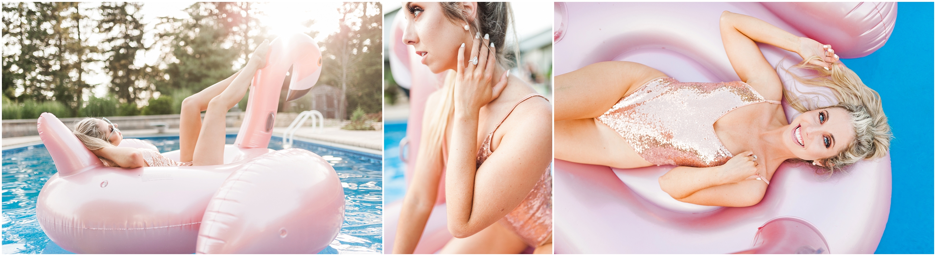 To say this was a fun day would be a complete understatement! When Steph and I talked about collaborating for this shoot, I thought it sounded like great idea but had no idea what to expect. When she showed up though, I immediately knew this would turn into a Pinterest-ers dream. She came SO prepared from the giant blowup flamingo floaty to the glittery rose gold body suit, I felt like I was in a magazine shoot! Not only did hair & makeup perfect the look Stephanie was going for, the weather was also on our side (and it wasn’t even cold falling in!)