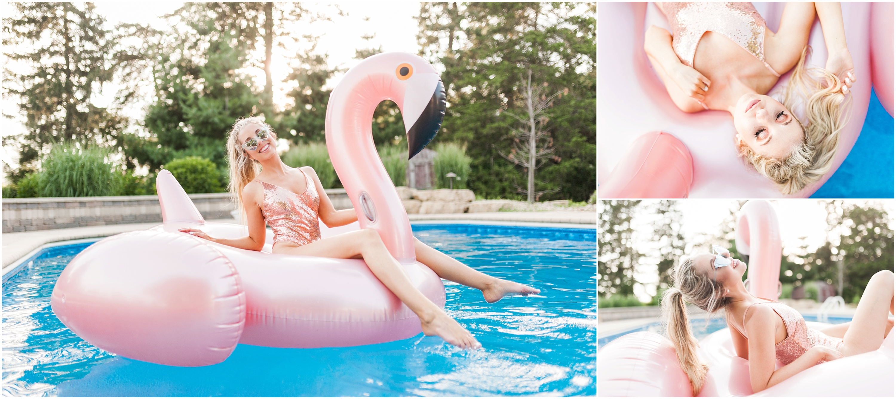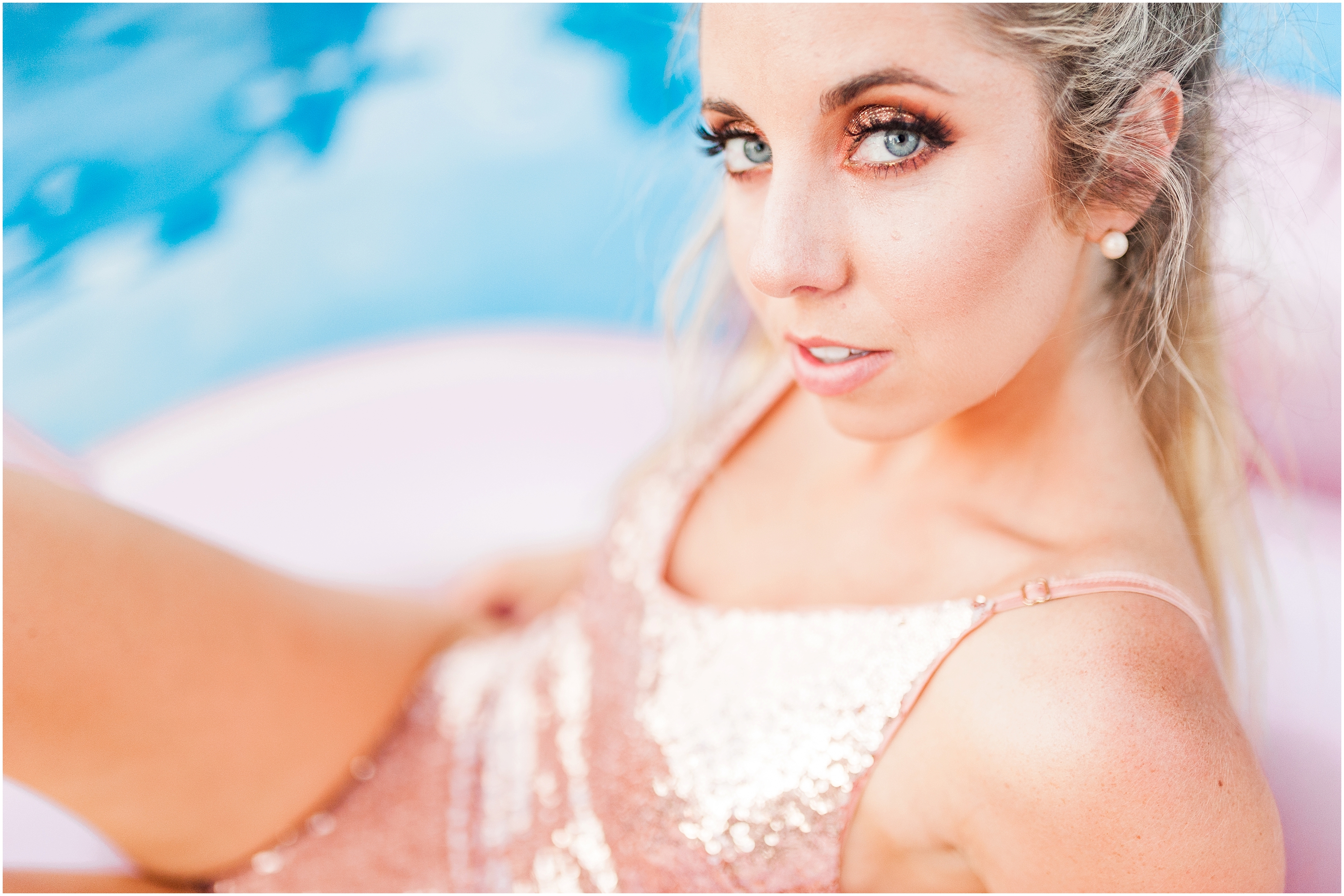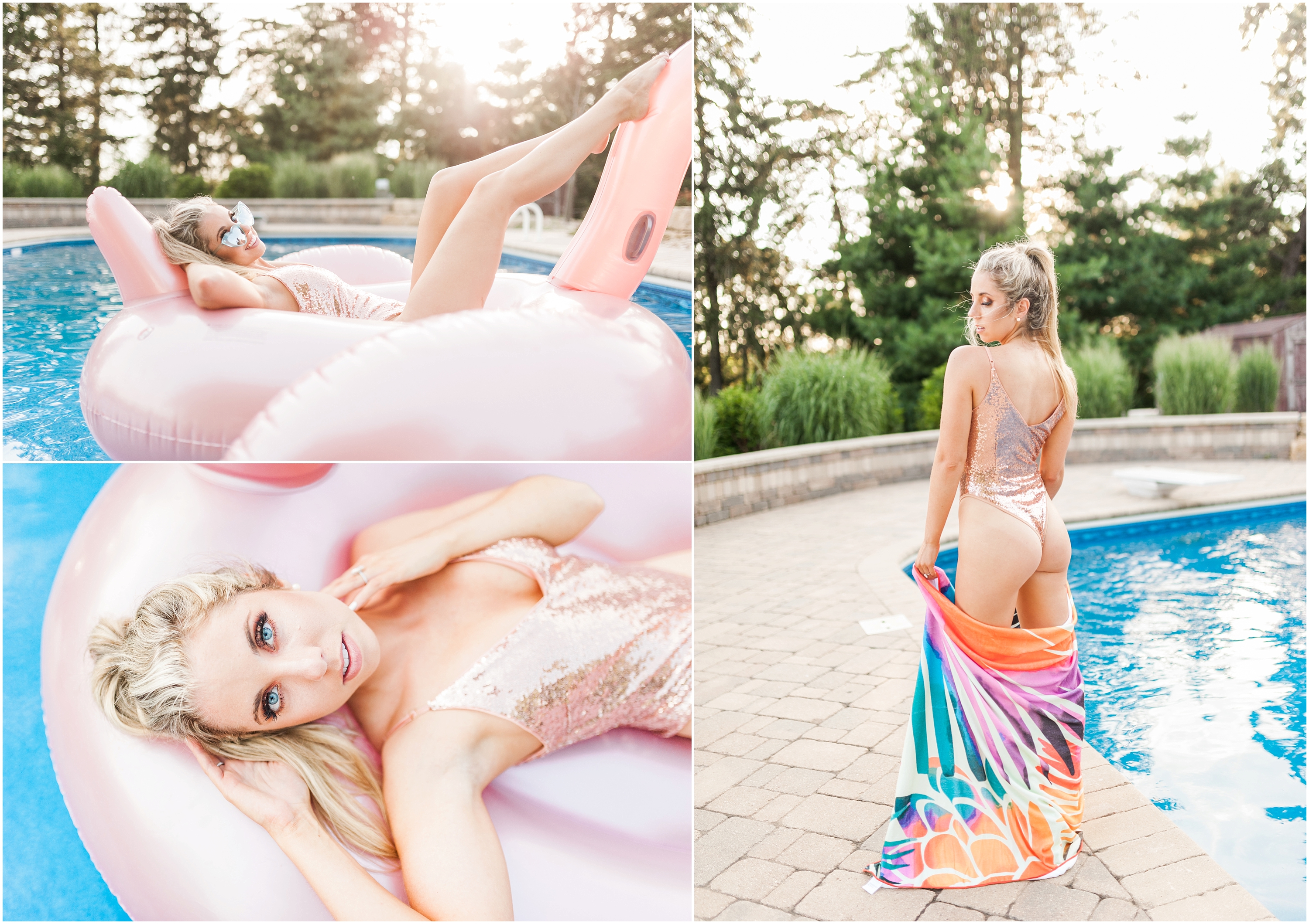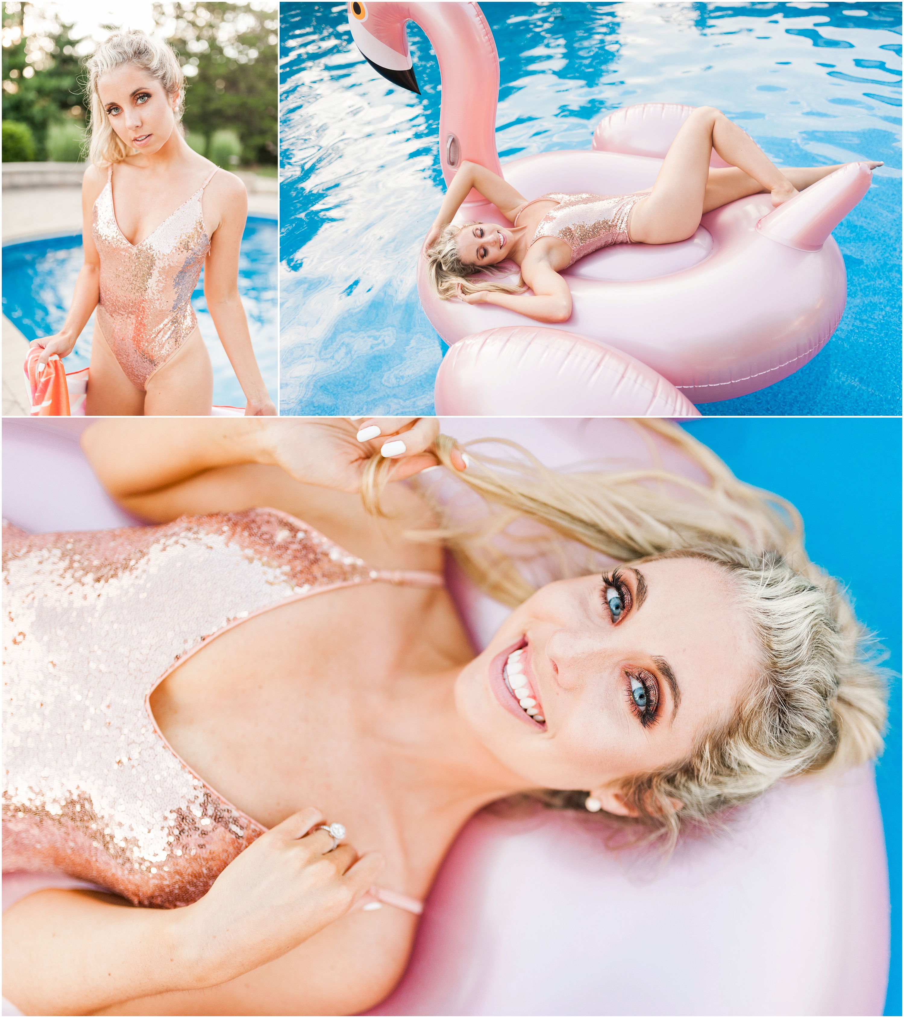 To say this was a fun day would be a complete understatement! When Steph and I talked about collaborating for this shoot, I thought it sounded like great idea but had no idea what to expect. When she showed up though, I immediately knew this would turn into a Pinterest-ers dream. She came SO prepared from the giant blowup flamingo floaty to the glittery rose gold body suit, I felt like I was in a magazine shoot! Not only did hair & makeup perfect the look Stephanie was going for, the weather was also on our side (and it wasn’t even cold falling in!)